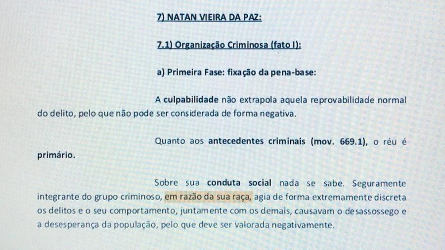 Mais um caso de racismo no Brasil vem a tona, dessa vez em Curitiba, capital paranaense, a vítima foi Natan Vieira da Paz, de 42 anos, que foi condenado a 14 anos e dois meses de prisão por organização criminosa e roubos, porem na decisão, a juíza Inês Marchalek Zarpelon afirmou que nada se sabe sob a conduta social do acusado, que é réu primário, porém ainda sim o condenou e justificou a decisão dizendo que o réu e “seguramente integrante do grupo criminoso, em razão da sua raça“.