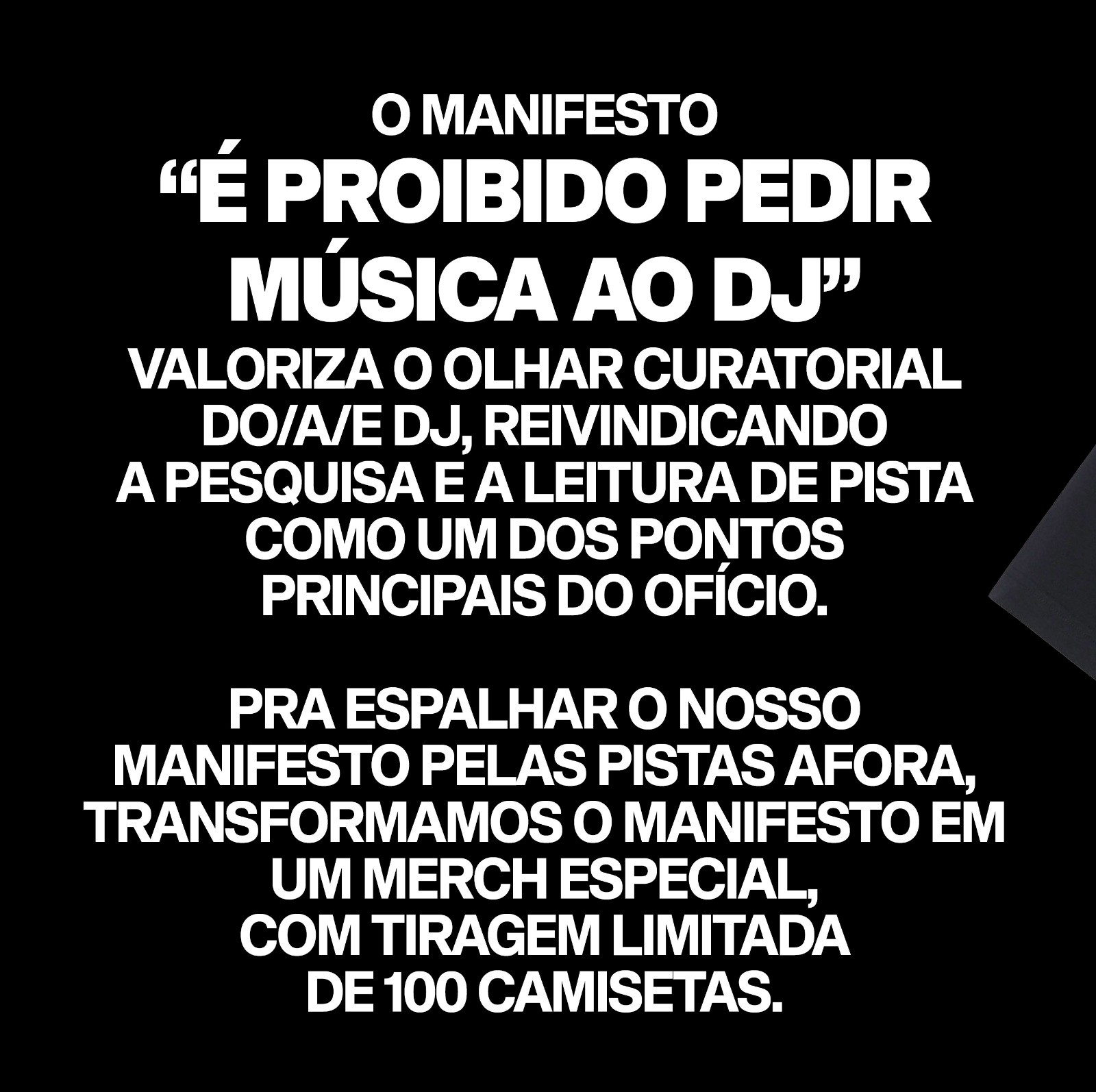 A BATEKOO, maior plataforma e festival pensando e propondo entretenimento, cultura e educação por e para comunidade negra e LGBTQI+ do Brasil, apresenta o seu mais recente manifesto. Intitulado “PROIBIDO PEDIR MÚSICA AO DJ”, o manifesto tem como objetivo principal destacar a importância do olhar curatorial dos profissionais que comandam as pistas de dança, enfatizando a valorização da pesquisa e da sensibilidade como elementos essenciais de sua arte.