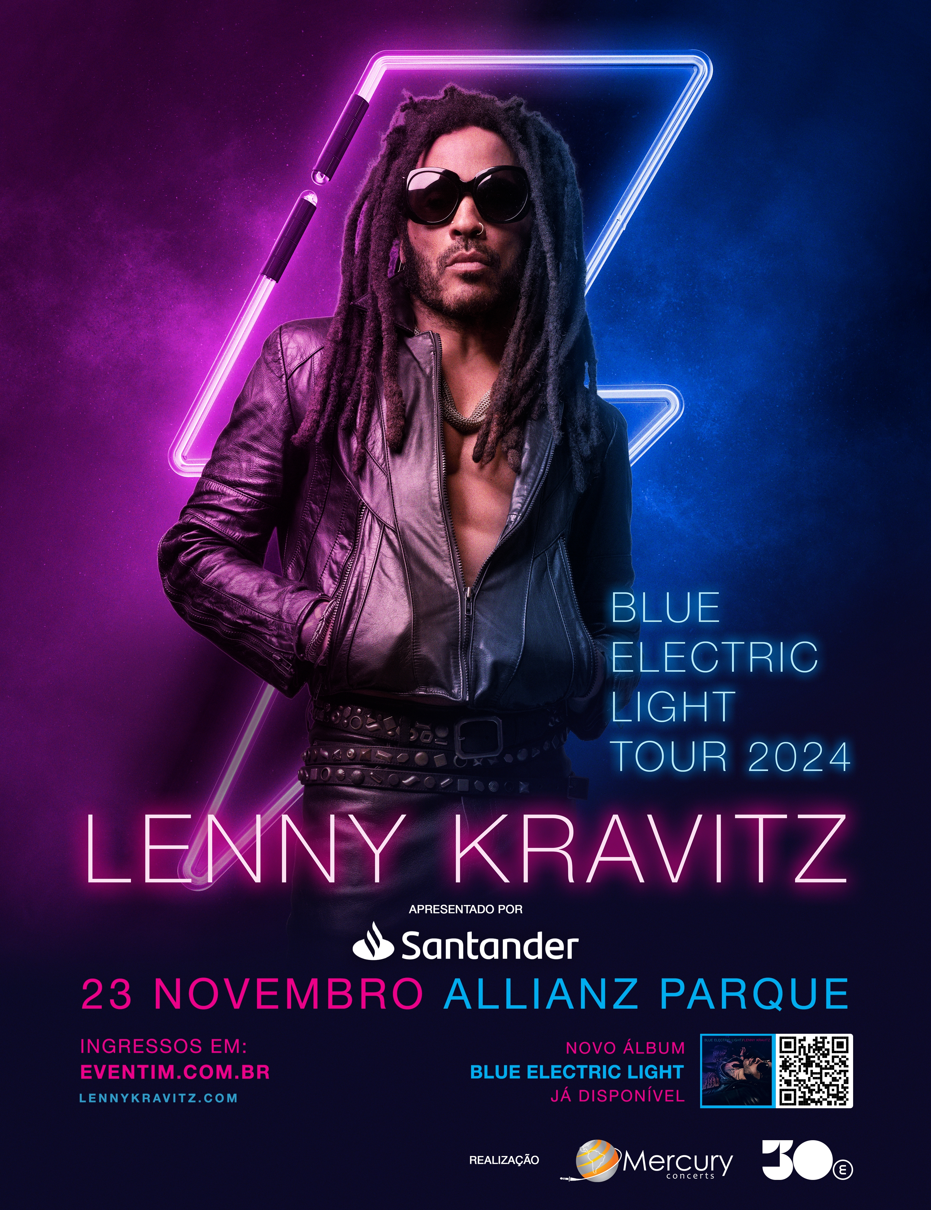 O escritor, produtor, multi-instrumentista vencedor de quatro prêmios GRAMMY®, Lenny Kravitz anuncia seu retorno ao Brasil com a inclusão de uma apresentação em São Paulo da turnê mundial Blue Electric Light Tour 2024. O show acontece no dia 23 de novembro, no Allianz Parque, em uma coprodução da 30e e Mercury Concerts, apresentado pelo Santander Brasil.