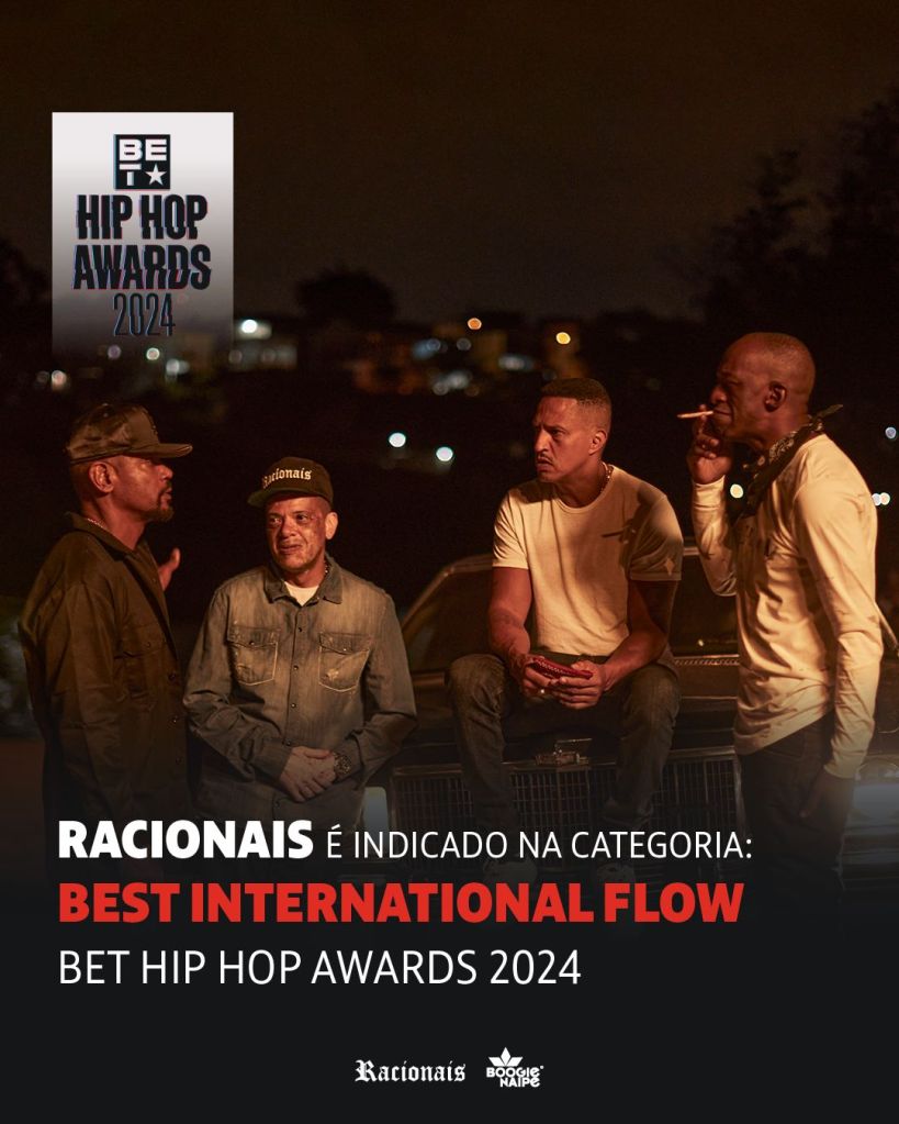 A importância do Racionais MC’s transcende a música e a cultura brasileira. Formado por Mano Brown, Ice Blue, KL Jay e Edi Rock, o grupo é elemento fundamental para explicar a sociedade do país e, não à toa, passou a receber honrarias de universidades e órgãos oficiais. Agora, o quarteto ganha um reconhecimento internacional, tendo sido indicado ao BET Hip Hop Awards 2024 na categoria “Best International Flow”.