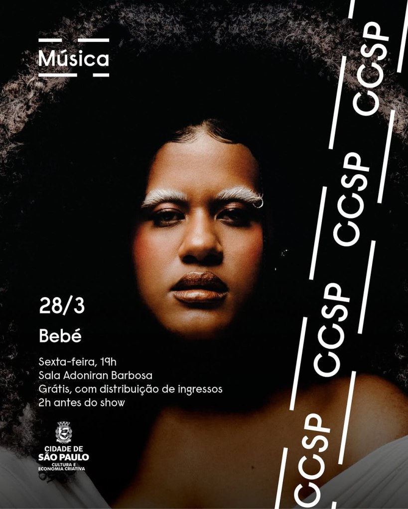 A cantora, compositora e produtora musical Bebé apresentará o show de lançamento de seu segundo álbum, SALVE-SE!, no Centro Cultural São Paulo (CCSP). A apresentação está marcada para sexta-feira, 28 de março, às 19h, na Sala Adoniran Barbosa, com entrada gratuita.