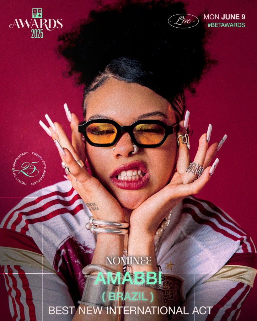 Na categoria Best New International Act, Amabbi se destaca como uma das revelações mais potentes da nova cena musical brasileira. Criada na Zona Norte de São Paulo, começou sua jornada na música cantando em corais de igreja e rodas de samba. Sua carreira deu um salto ao assinar com a gravadora Som Livre, com quem lançou o EP AMABBI. Em 2024, lançou seu primeiro álbum, Versos e Voos, que conta com colaborações de nomes como Xamã, FBC, Budah e NP Vocal. Com letras que falam de amor, liberdade e superação, sua sonoridade mistura rap, R&B e trap, refletindo as influências da vivência periférica e urbana.