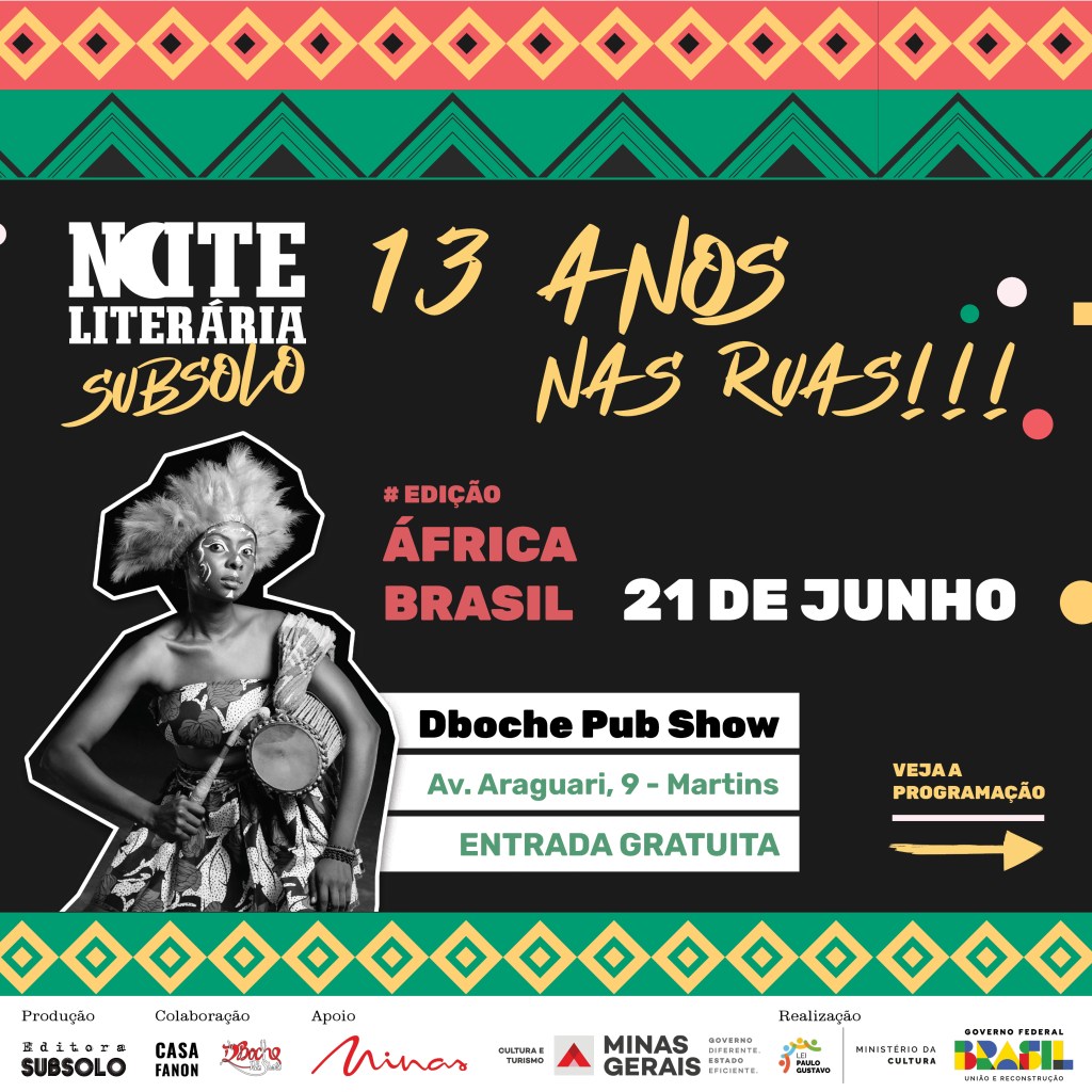 A próxima edição da Noite Literária acontece neste sábado, 21 de junho, no Dboche Pub Show, em Uberlândia, com uma programação gratuita voltada à literatura, poesia, música e ancestralidade. Intitulada África Brasil, a edição homenageia as raízes africanas e as vivências à margem que atravessam a cultura brasileira, reunindo artistas que transformam sua trajetória em arte e resistência.