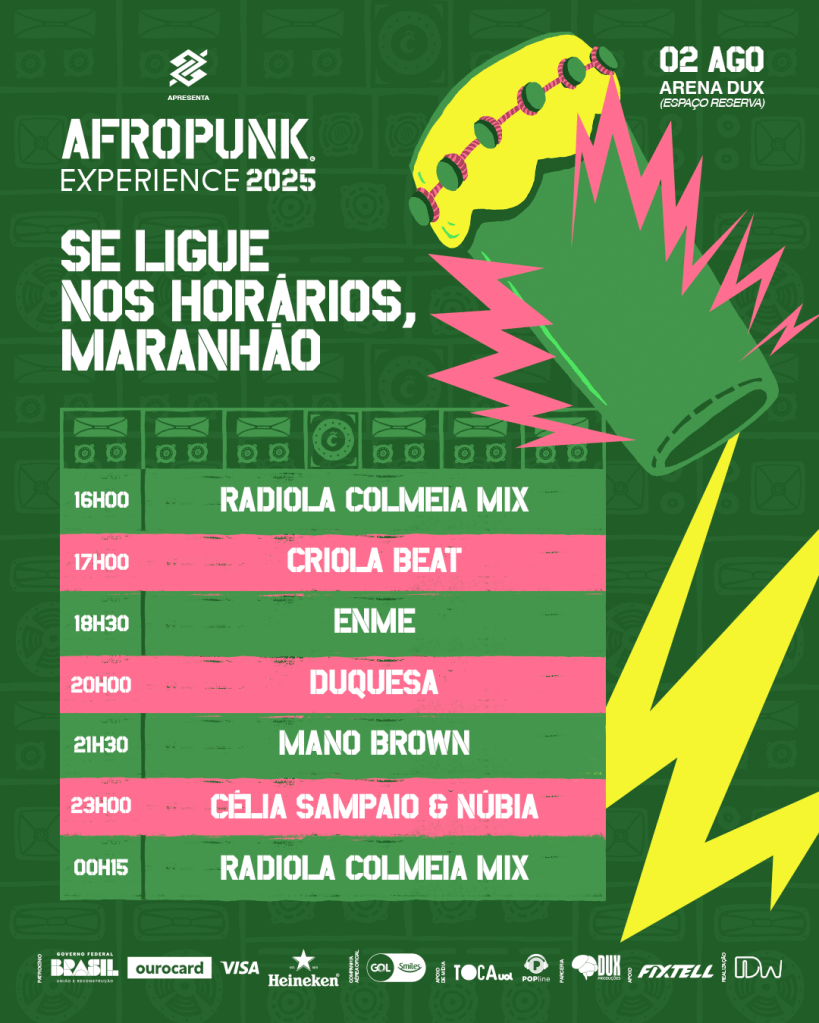 Com programação potente e diversa, o AFROPUNK Experience Maranhão revelou os horários dos shows que tomarão conta da Arena Dux, em São Luís, no próximo dia 02 de agosto. O evento celebra a música preta em suas múltiplas vertentes e reúne nomes que transitam entre o reggae, o rap e outras sonoridades: Mano Brown, Duquesa, ENME, Criola Beat, Célia Sampaio e Núbia. Apresentado pelo Banco do Brasil (BB), o AFROPUNK Experience Maranhão tem últimos ingressos disponíveis.