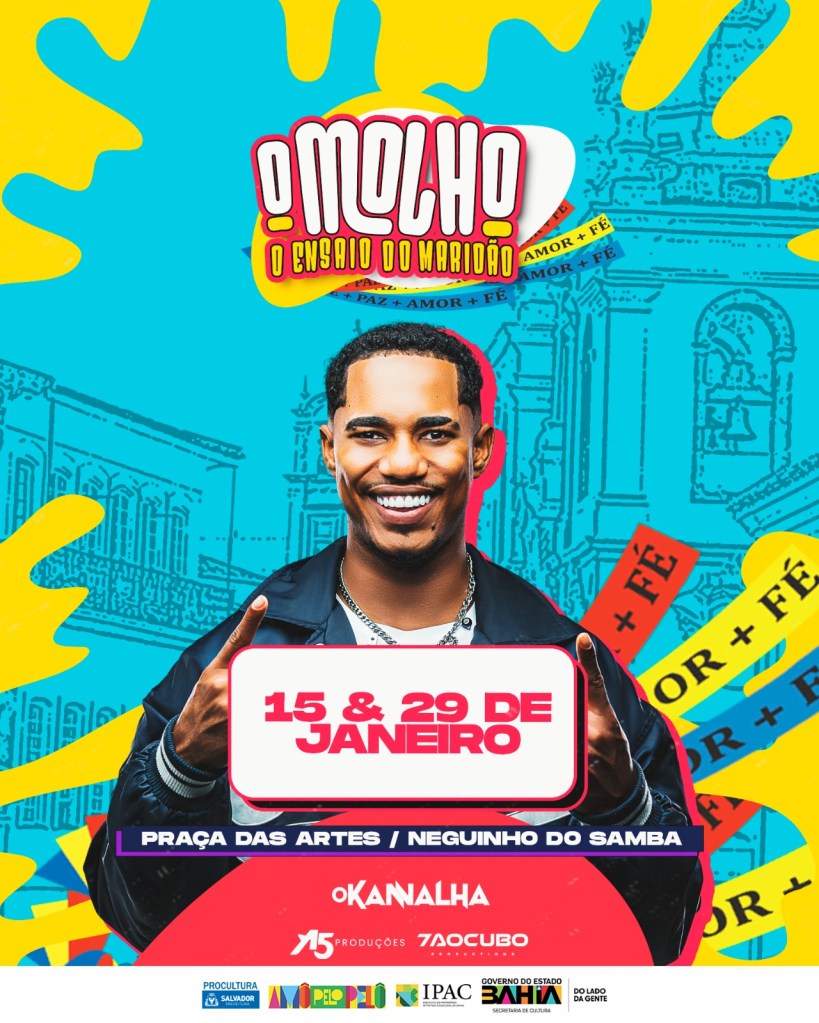 “O verão no Pelô tem dendê, tem suor e tem muito molho! Dia 15 e 29 de janeiro é todo mundo na Praça das Artes, pra sentir de perto o ‘Ensaio do Maridão’! Vem escrever essa história com a gente, vem curtir, que 2026 está só começando”, convida O Kannalha.