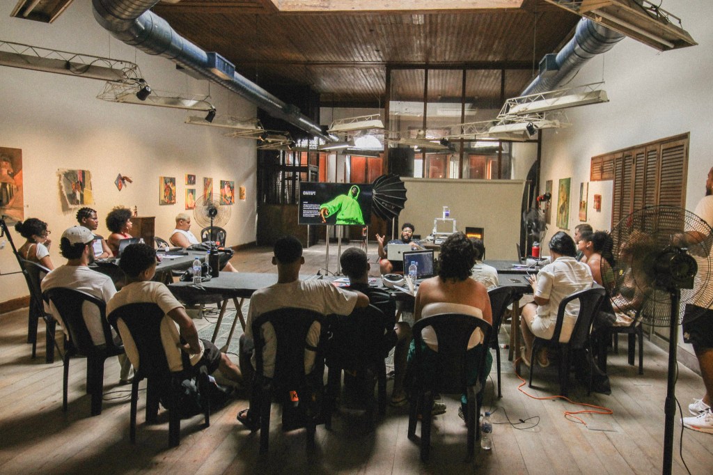 Com foco no desenvolvimento de projetos de artes visuais, vídeo e áudio, a programação começou com uma oficina conduzida por Zamba, consagrado como diretor criativo de grandes projetos musicais como Àttooxxá e Yan Cloud. A mentoria abordou a construção de narrativas e as etapas de um processo criativo, apresentando o uso de ferramentas de inteligência artificial generativa.