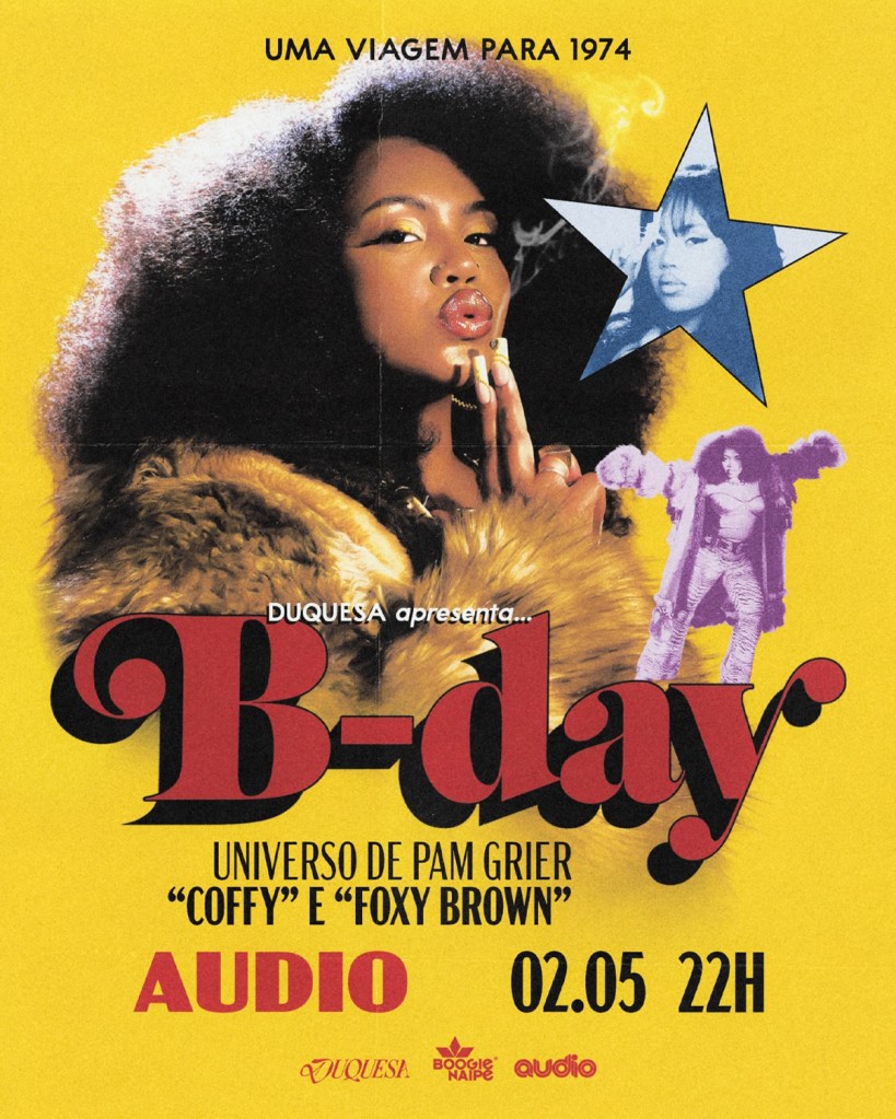 Com o tema universo de Pam Grier – “Coffy” e “Foxy Brown”, Duquesa anuncia a segunda edição do B-Day da Duq, na Audio, em São Paulo, convidando o público a vivenciar uma viagem a 1974. O evento acontece no dia 02 de maio, a partir das 22h.