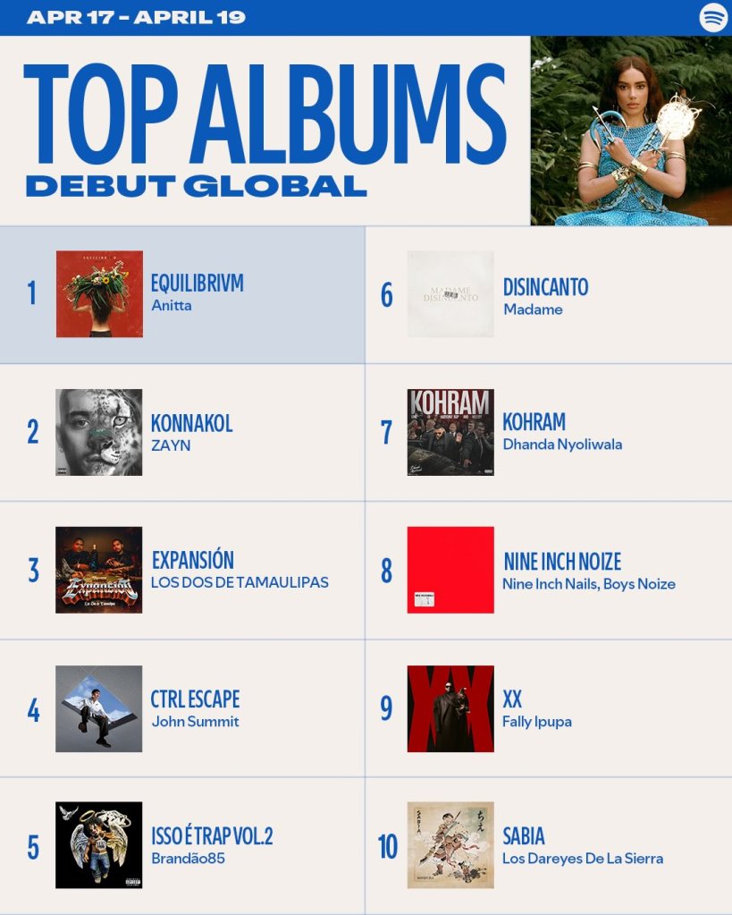 O feito coloca Anitta à frente de nomes como Zayn, Nine Inch Nails e John Summit na parada referente ao período de 17 a 19 de abril, confirmada pelo próprio perfil oficial do Spotify.